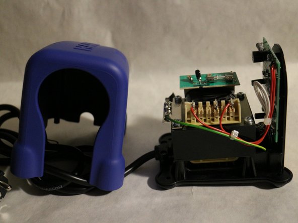 - پس از برداشتن پیچها، روکش پلاستیکی آبی بالا میتواند برداشته شده تا قطعات داخلی مشاهده شوند.